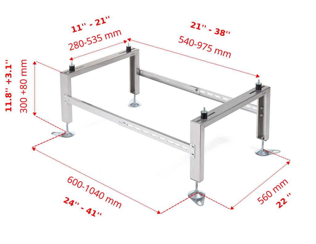 Residential and commercial buildings – for mounting split air conditioning units and heat pumps on external walls or floors. Industrial facilities – for professional installation of HVAC equipment. Outdoor and indoor installations – weather-resistant stainless steel construction suitable for all conditions. Installation is extremely easy with adjustable mounting widths from 280 to 535 mm and mounting depths from 540 to 975 mm, ensuring perfect fit for your equipment and providing peace of mind and reliability.